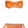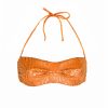 Orange stretch fabric with golden laminated animal print. Furthermore the orange color is studied to enhance the light skins that are tanning and the golden skins already kissed by the sun. Spices, perfumes of the East, adventures on wild beaches: certainly an “inspirational” Safari bikini for unforgettable journeys. Entirely hand made in Italy with love.