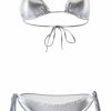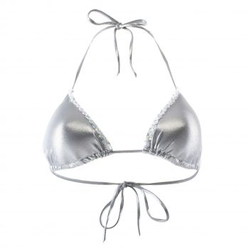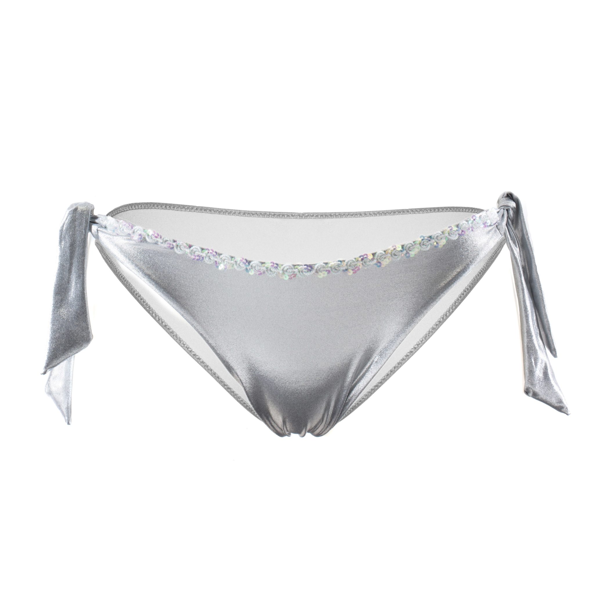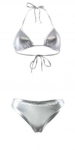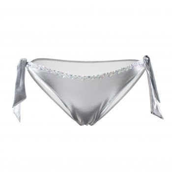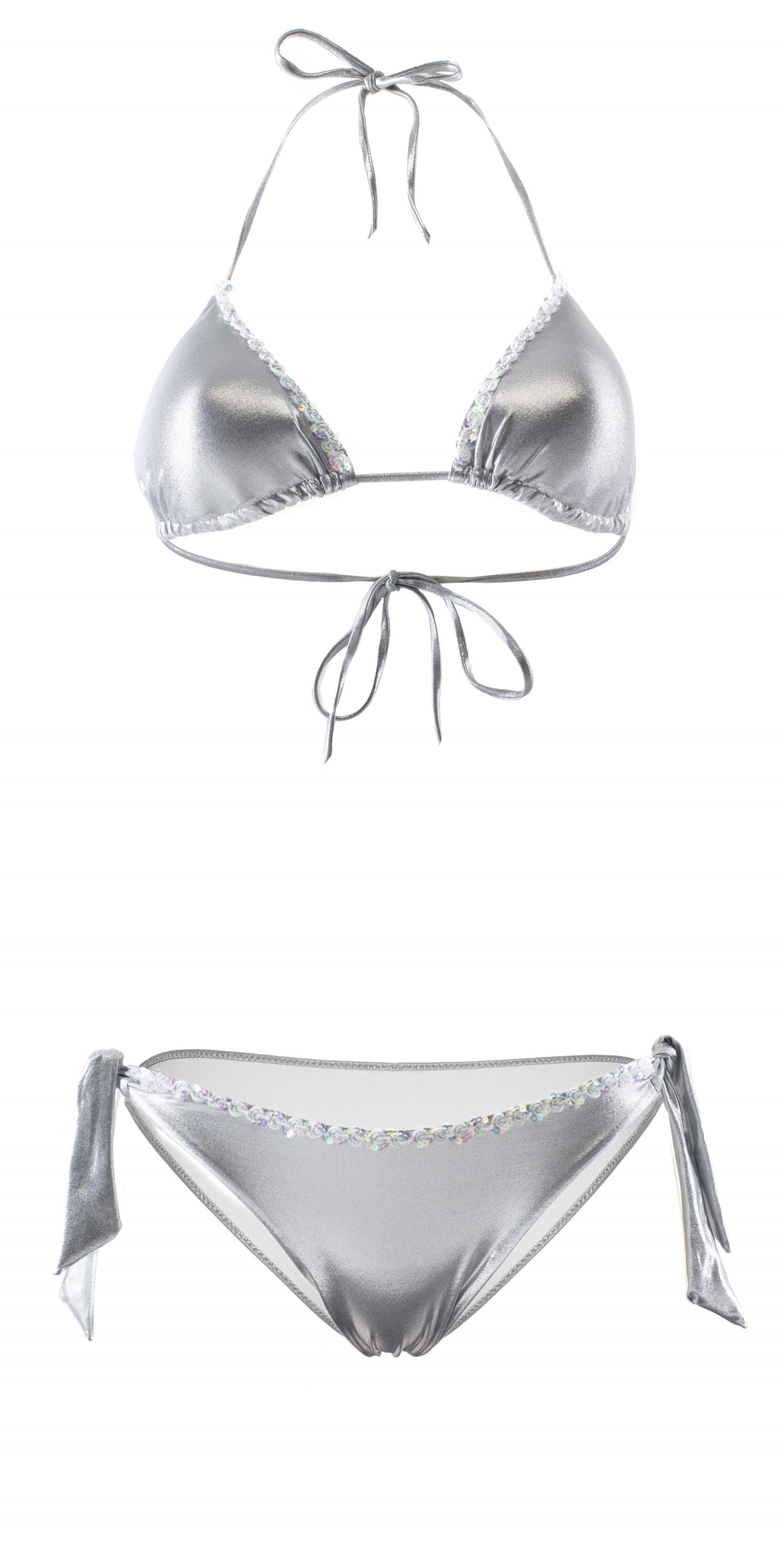Tessuto luxury elasticizzato laminato argento. Impreziosito con passamaneria lurex argentata e sfavillanti micro pailettes dalle nuance lunari. Un piccolo gioiello seducente da indossare in spiaggia e durante le occasioni mondane per risplendere da mattina a sera. Interamente cucito e decorato a mano in Italia.