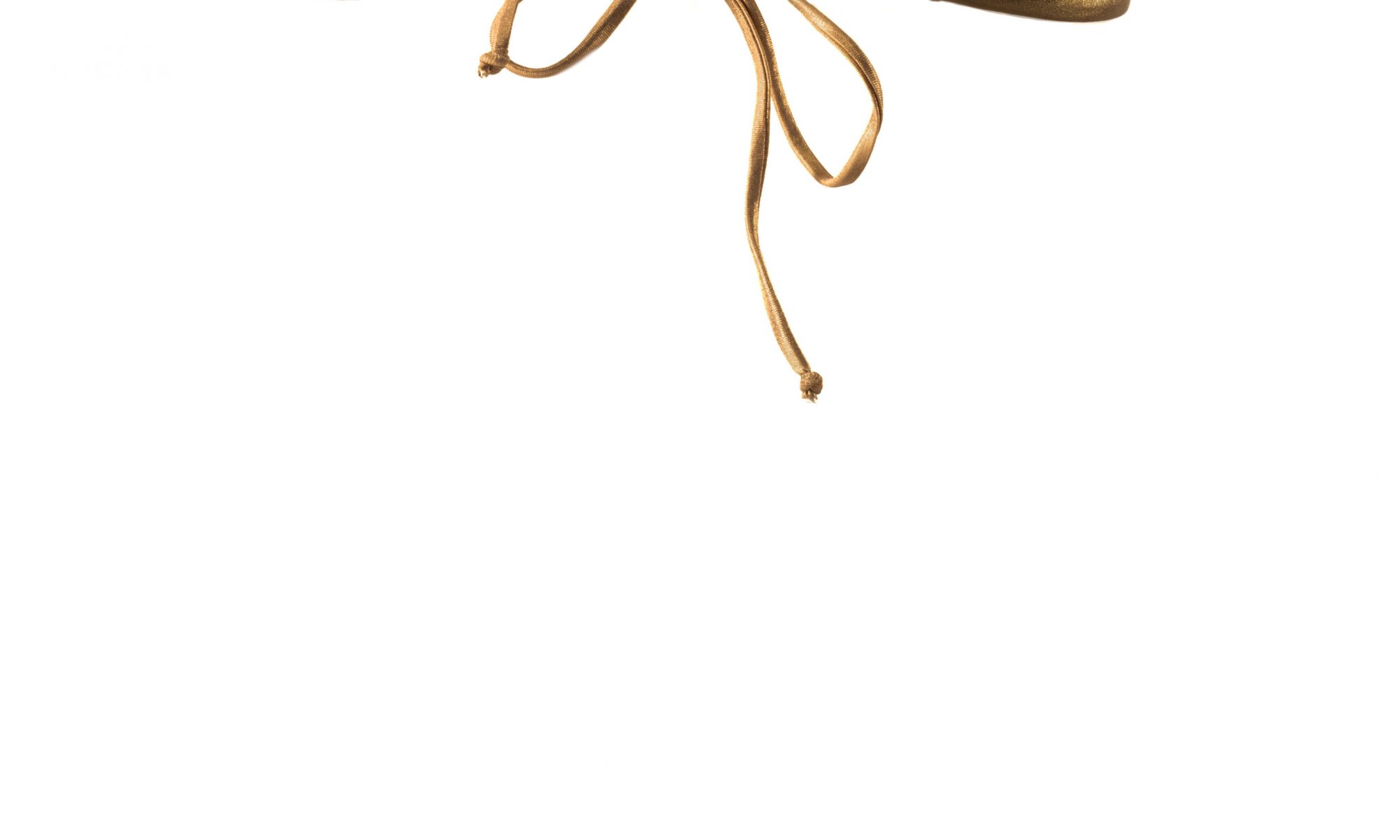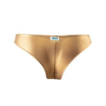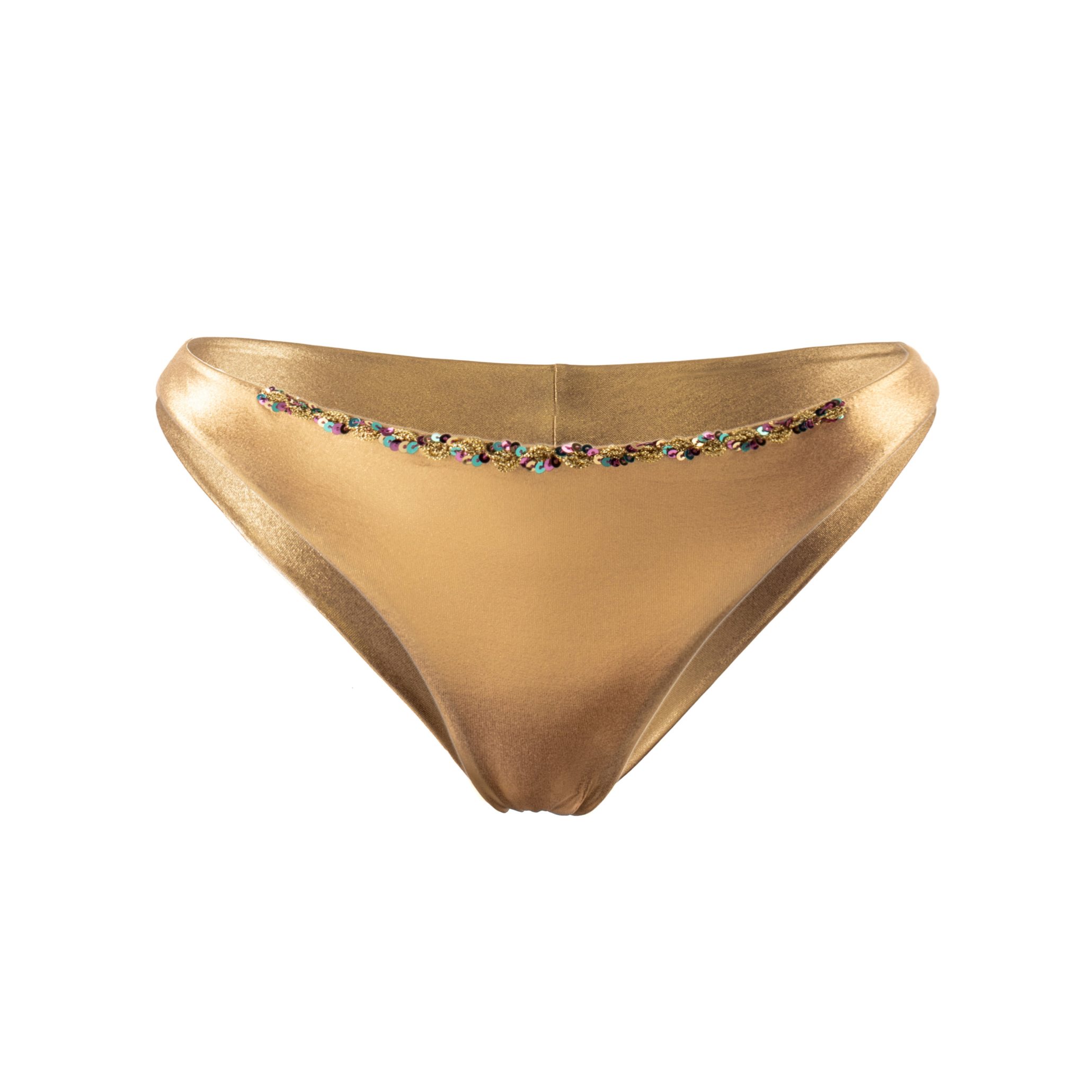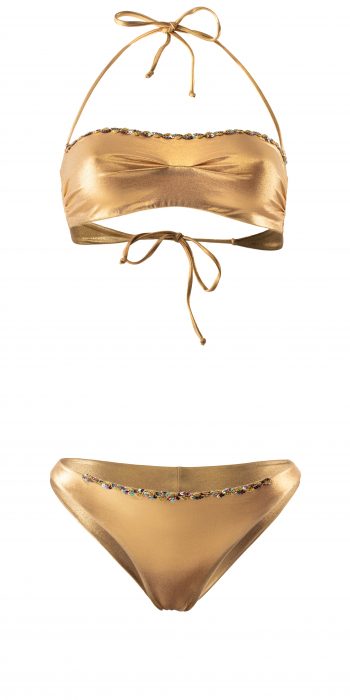 Tessuto luxury elasticizzato laminato oro. Impreziosito con passamaneria con lurex dorata e sfavillanti micro pailettes rosa e acquamarina. Un piccolo gioiello seducente da indossare in spiaggia e durante le occasioni mondane, per risplendere da mattina a sera. Interamente cucito e decorato a mano in Italia.