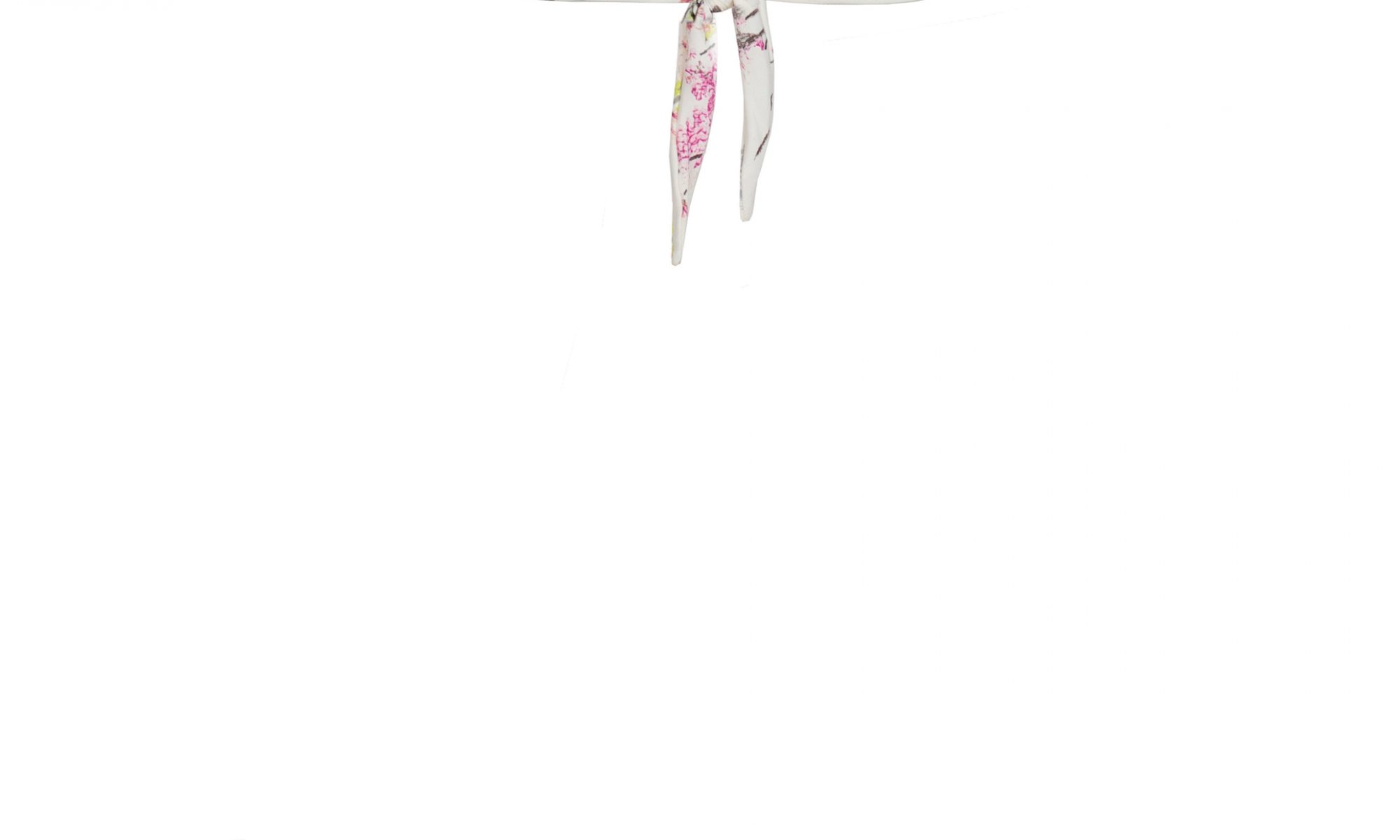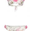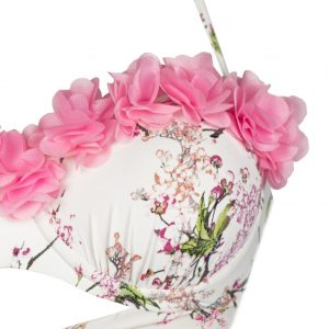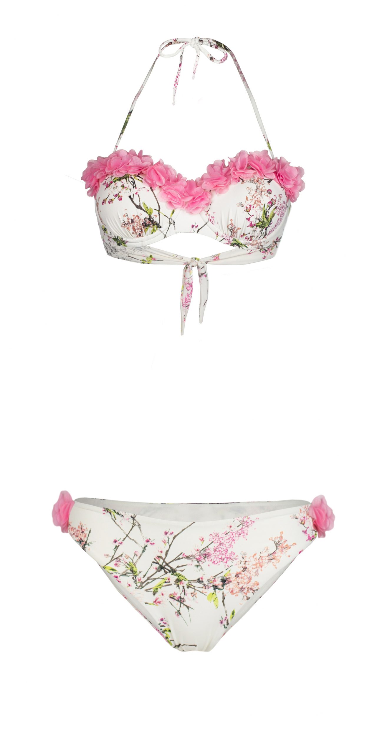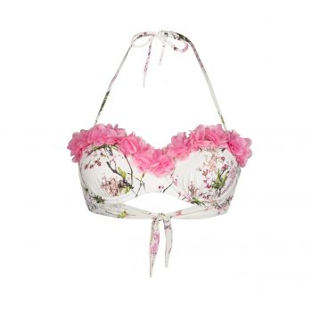 Un bikini bon ton dall’esclusiva stampa floreale in lycra setosa, impreziosito da fiori in tulle leggero, dedicato agli animi più romantici.