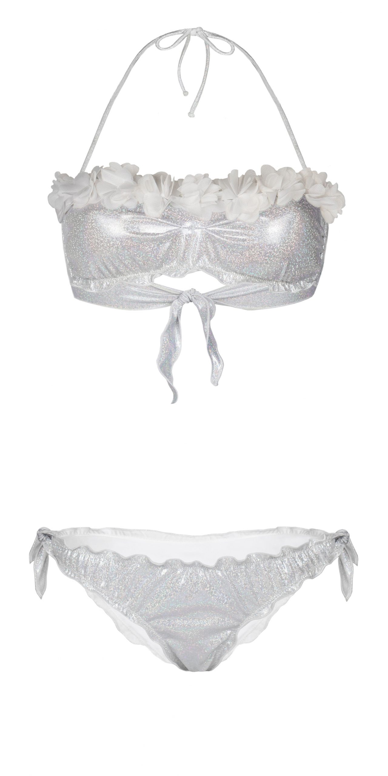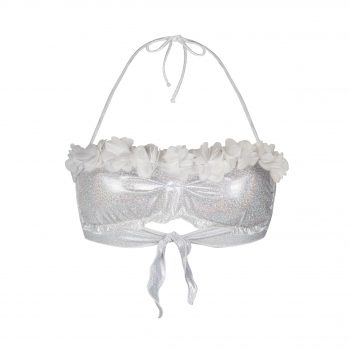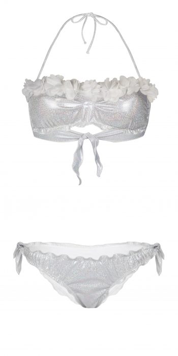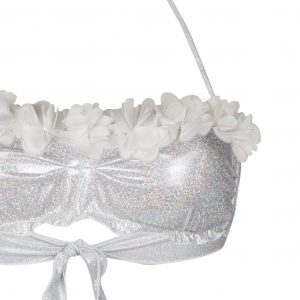 - Fascia rouches a cuore Betty con coppette estraibili, stecchette laterali per un maggior sostegno e lacci rimovibili. Ricamata a mano con fiori in tulle bianco: il sogno di una donna in un bikini.